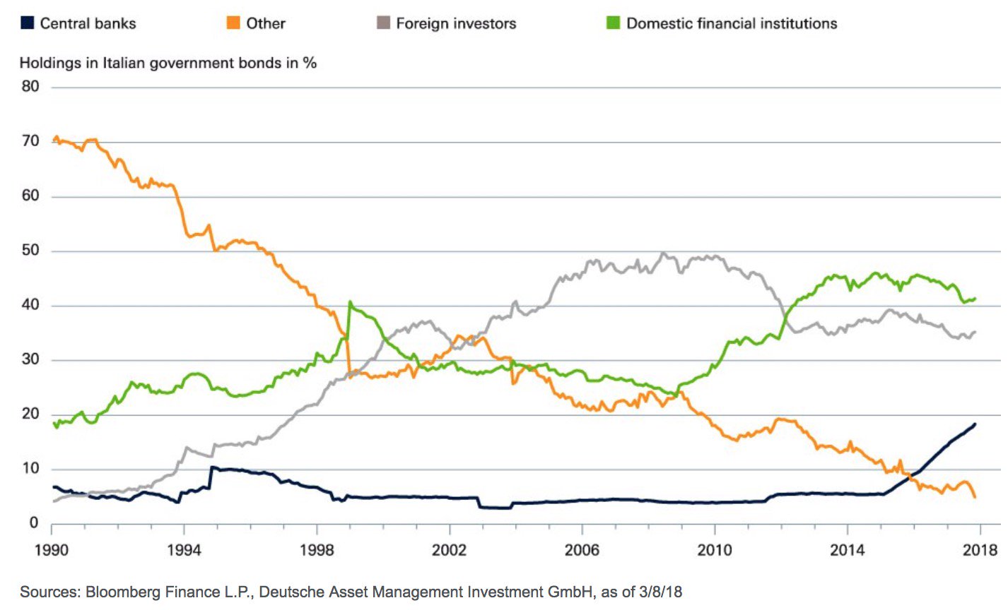 Second, in December 2018 the ECB is ending its bond-buying programme. This matters greatly for Italy since, for the last three years, the ECB was the only net buyer of Italian government bonds. From next year on, Italy will need to rely almost entirely on private markets to buy any new bonds it issues to fund its promises.[1] Currently, foreign investors and domestic banks together hold 75% of Italian debt, while Italian households hold less than 10%.