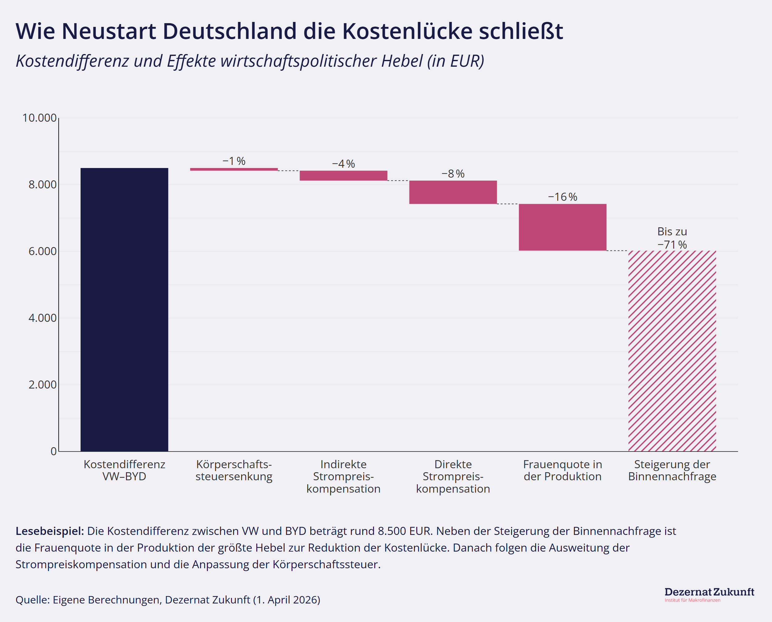 Erste Maßnahmen hat die Bundesregierung bereits umgesetzt. Die Kostendifferenz zwischen einem BYD und einem VW liegt schätzungsweise zwischen 8000 und 9000 Euro. Die schrittweise Senkung der Körperschaftsteuer reduziert diese Differenz um circa 80 Euro pro Fahrzeug. Ein erstes Prozent ist geschafft (Abbildung 1).
