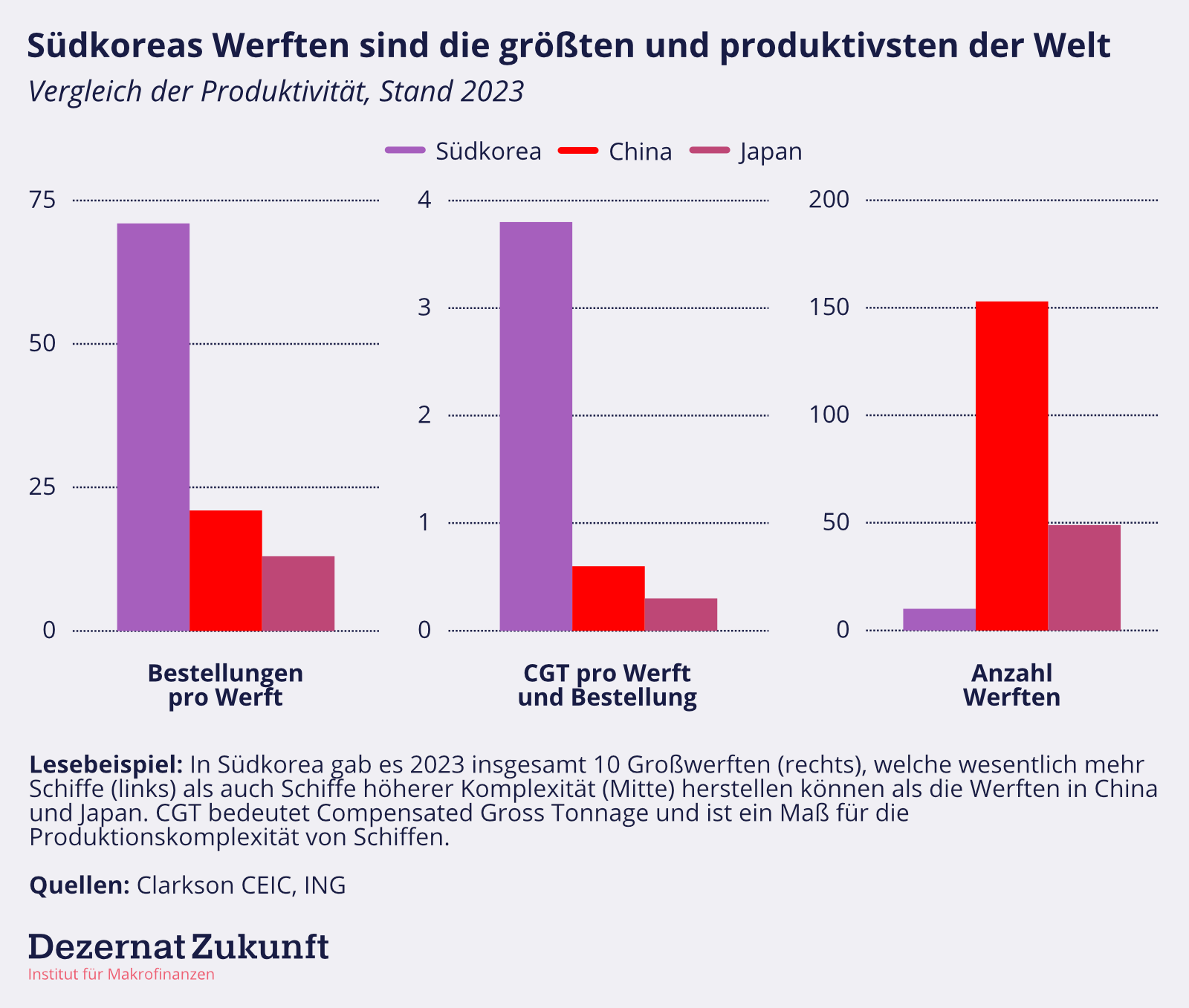 Der südkoreanische Schiffbau verlor in den 2010er Jahren massiv Marktanteile. Die Lohnkosten waren zu hoch und die globale Nachfragekrise traf Südkorea durch hohe Exportabhängigkeit besonders hart. Die Regierung trat die Flucht nach vorn an und fokussierte sich auf Spezialschiffe – zuerst für die Ölindustrie. Diese Strategie scheiterte kläglich. Die Projekte verzögerten sich und wurden zu teuer, und die Ölkrise 2016 tat ihr Übriges. Im April 2016 wurde kein einziges Schiff verkauft. Daraufhin wurden Werften restrukturiert, konsolidiert und rekapitalisiert. Dazu fokussierte die Regierung die Strategie auf Hightech-Segmente wie LNG-Schiffe. Der Rest ist Geschichte. Die Werften sind heute die produktivsten der Welt und produzieren an der Kapazitätsgrenze. Wie lange das anhält, ist schwer zu sagen. Aber vorerst ist aus einer totgesagten Industrie eine Erfolgsgeschichte geworden.