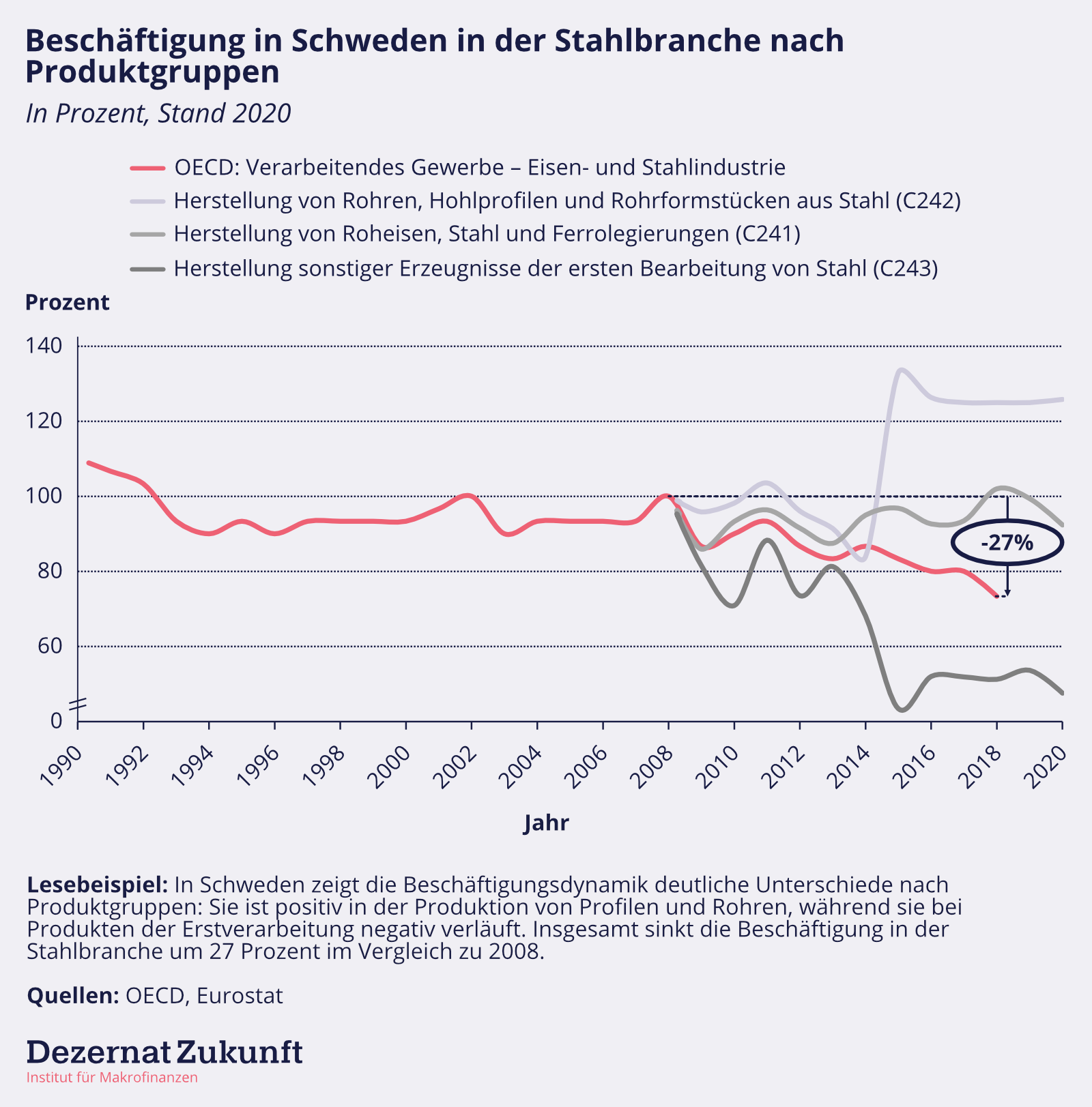 Südkorea kommt aus der Tradition einer Militärdiktatur. Staatliche Top-down-Planung ist historisch geübt und strukturell über technologisch fokussierte Ministerien gegeben. Die schwedische Fallstudie zeigt, dass eine ähnliche Strategie auch mit weniger staatlicher Kapazität funktionieren kann. Dort zogen Regierung und Unternehmen am gleichen Strang. Man einigte sich darauf, dass Grünstahl eine Möglichkeit für neues Wachstum ist. Die Unternehmen legten Wachstumsstrategien vor, woraus schließlich HYBRIT, ein öffentlich-privates Innovationsprojekt[1], entstand. Dieses Projekt ist globaler Technologievorreiter und brachte mit Stegra, einem Grünstahl-Startup mit mittlerweile 1500 Beschäftigten[2], sogar neuartige Marktakteure in einer „alten“ Industrie hervor. Wie erfolgreich das Grünstahlunterfangen am Ende ist, wird sich noch zeigen. Aber zum heutigen Zeitpunkt hat sich Schweden mit hoher Produktivität und komplexer Spezialstahlerzeugung Chinas Übermacht zumindest teilweise verwehren können. So gibt es bei komplexeren Stahlerzeugnissen sogar einen Beschäftigungszuwachs.